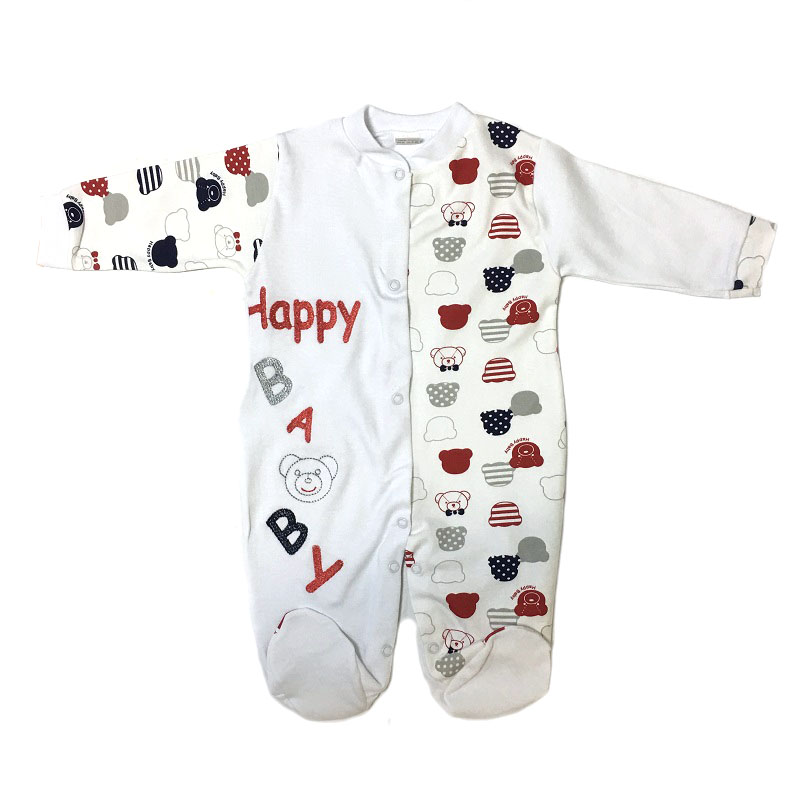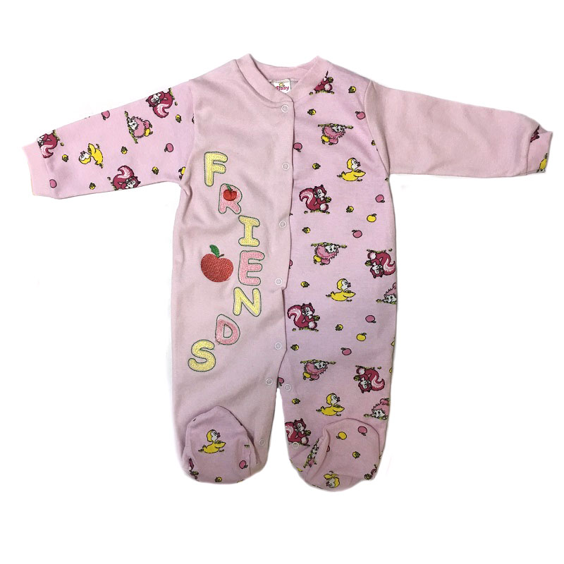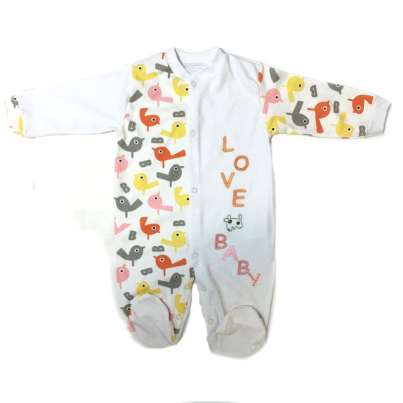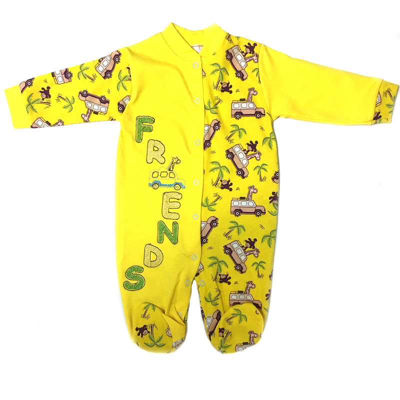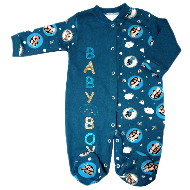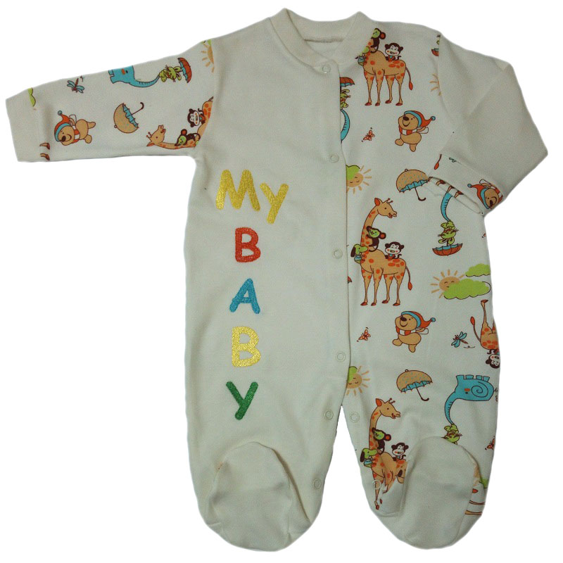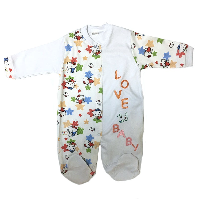 Комбинезон с длинным рукавом на манжетиках, с закрытыми ножками, без воротничка, спереди и между ножек на кнопочках. Спереди комбинезон украшен вышивкой на одной полочке. Расцветки и рисунки в каждой партии и в каждой упаковке отличаются.