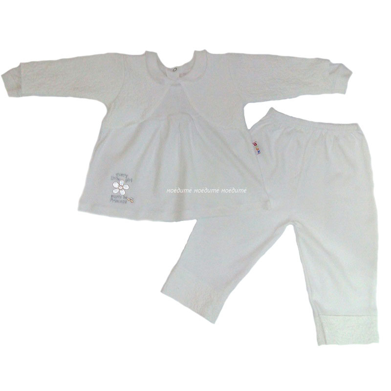 Кофточки-туники с отложным воротничком, с длинным рукавом на манжете, с 2 кнопочками сзади. Кофточка украшена вышивкой в виде цветочка, имитацией болеро из жатой ткани.